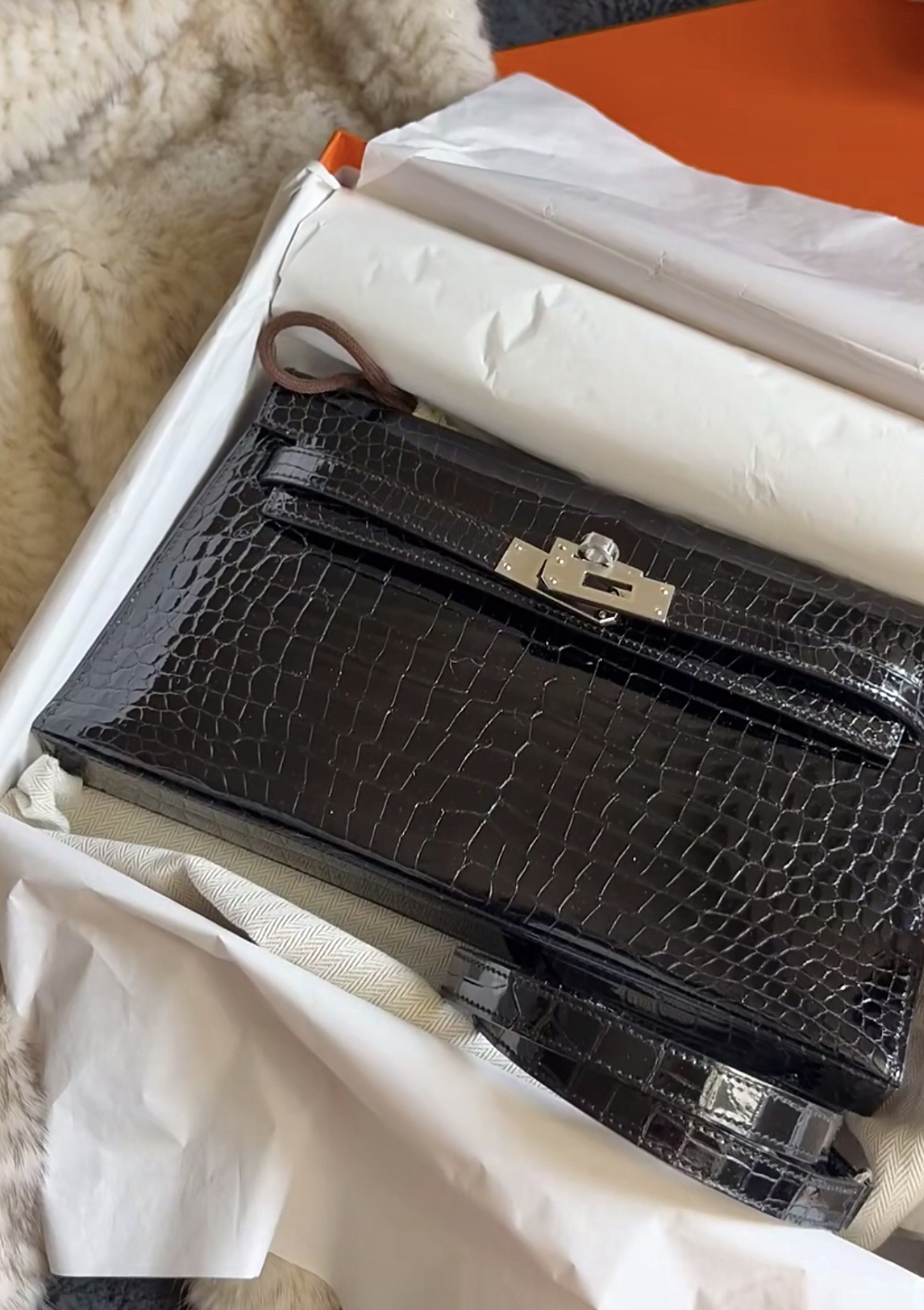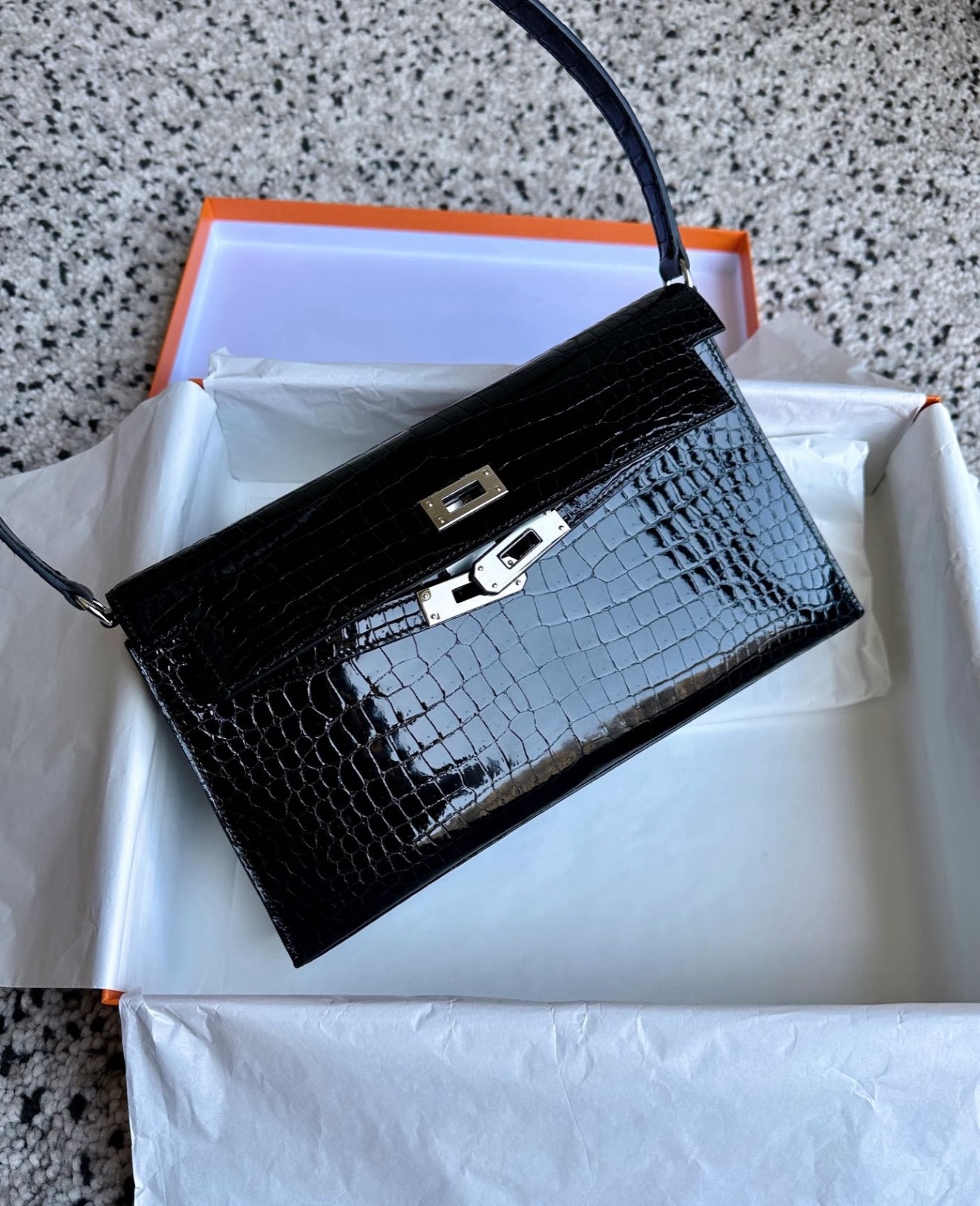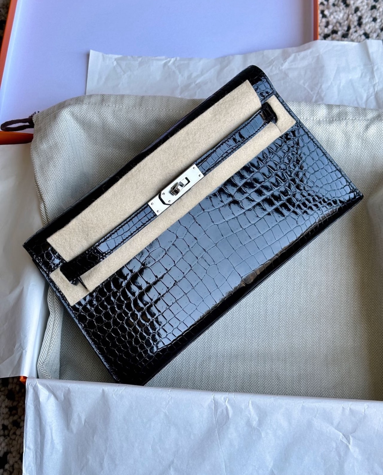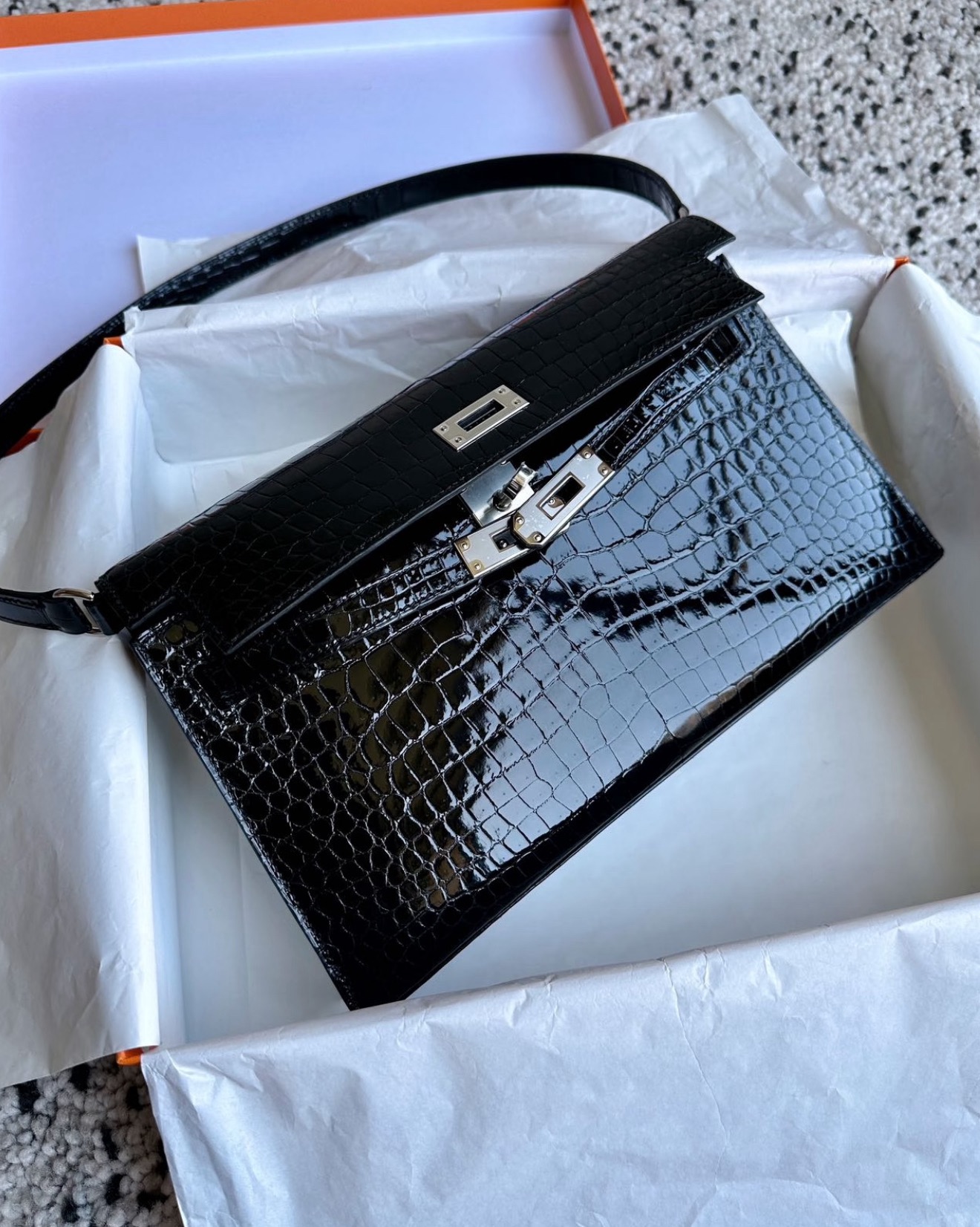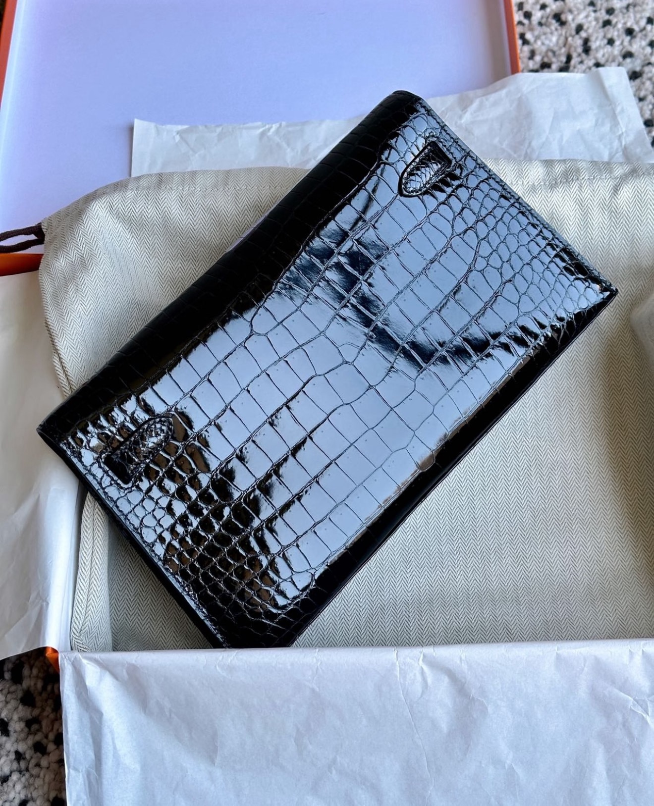 Qatar HERMES KellyElan 27cm Shiny Porosus Crocodile 亮面倒V澳洲灣鱷 Noir Phw