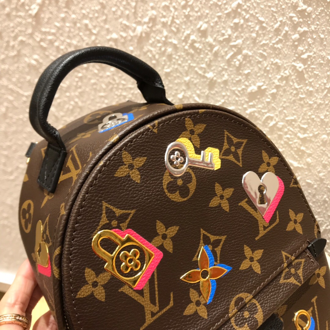 路易威登包包 LV女包 PALM SPRINGS 迷妳雙肩包 M44367 飾有源自2019春季Love Lock膠囊系列的鎖扣、鑰匙和花卉圖案:象征品牌特質與永不磨滅的愛。繽紛的金屬質感圖案與經典的Monogram帆布巧妙融合,營造出驚艷的3D效果。迷妳設計充滿魅力,是壹款浪漫的情人節佳禮,值得珍藏。
