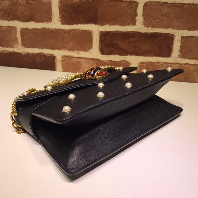 古馳gucci Broadway真皮手拿包 款式 453778 DVUDT 1096 鏈條手拿包,通體裝飾珍珠鉚釘和金屬蜜蜂細節。蜜蜂身體部分采用藍色琺瑯和紅色水晶寶石突出裝飾,翅膀部分配以珍珠效果鉚釘。黑色真皮,飾以珍珠